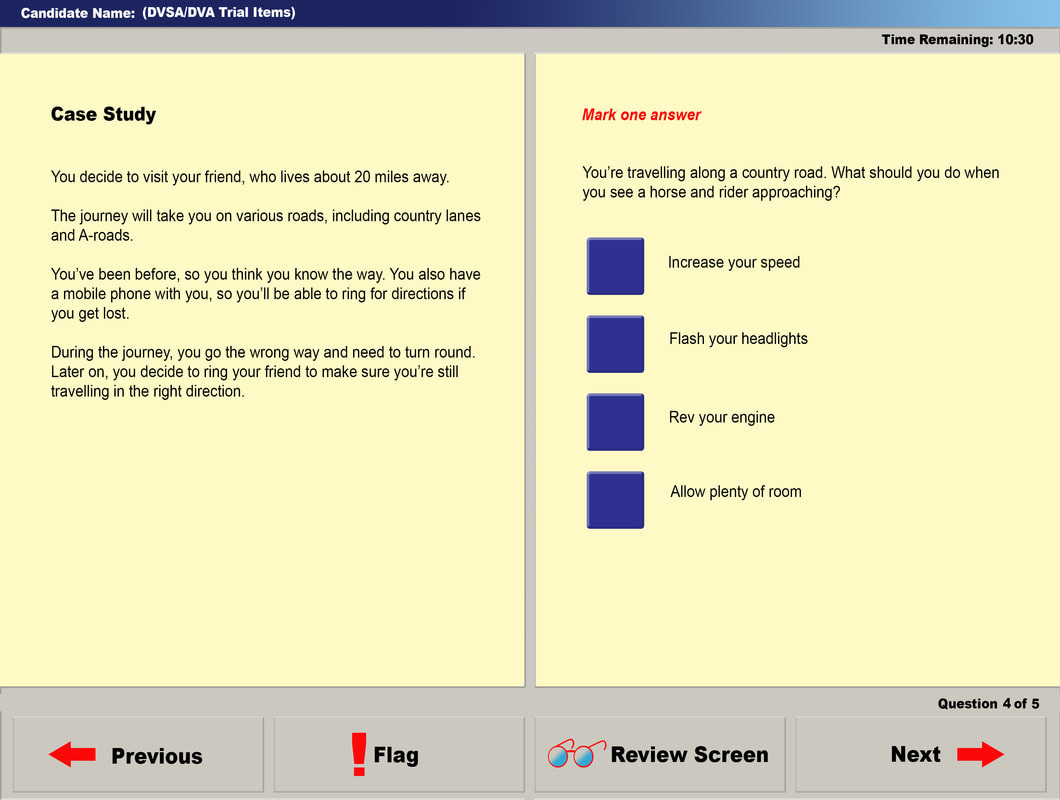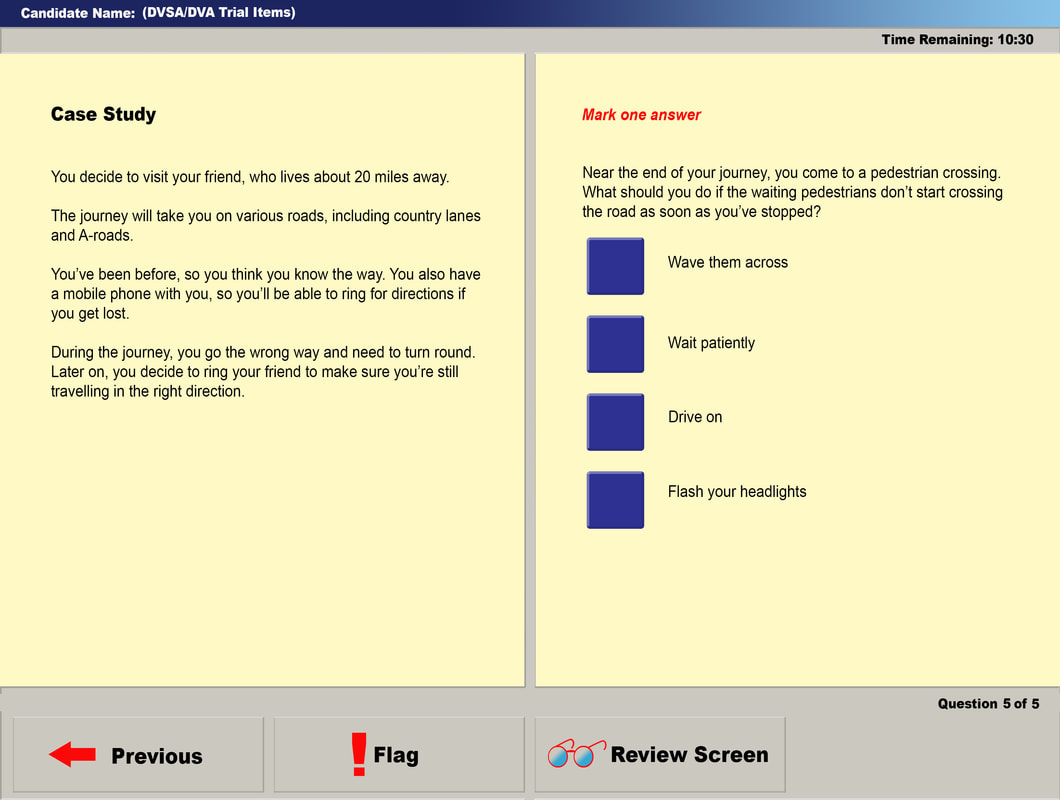 A case study appears like the below example; you’ll see a description of a driving scenario on the left hand of your screen, and a choice of answers on the right hand side. We recommend you read this case study through more than once to ensure you have understood the scenario before answering the questions.